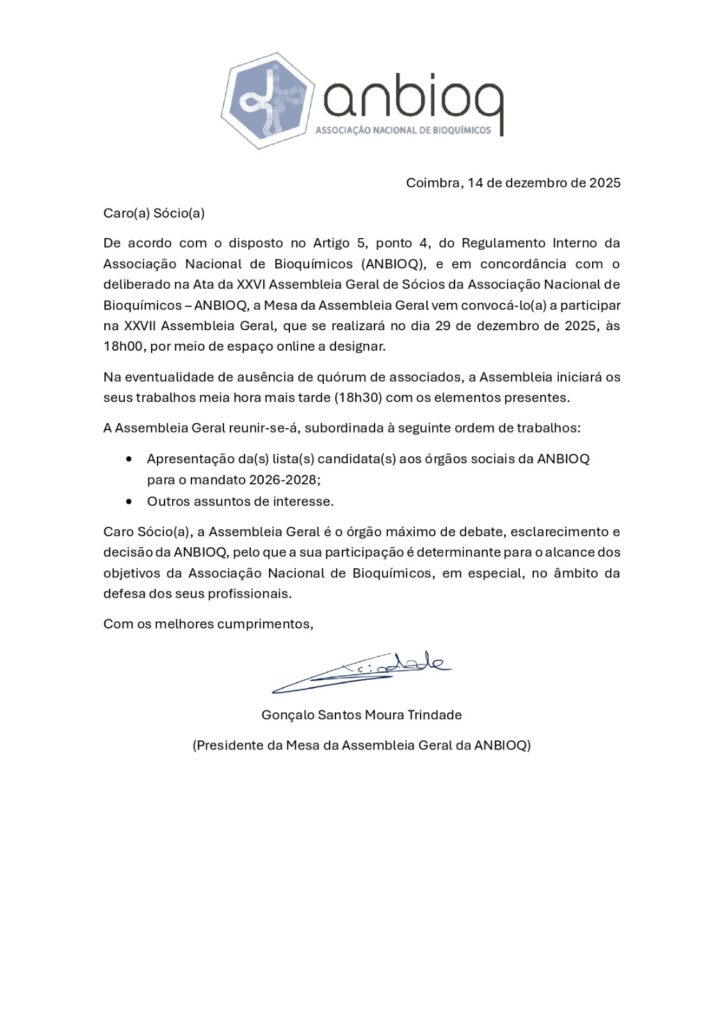 Convocatória XXVII Assembleia Geral Posted 14 Dezembro, 202514 Dezembro, 2025 anbioq Share this...EmailFacebookLinkedinTwitterWhatsapp